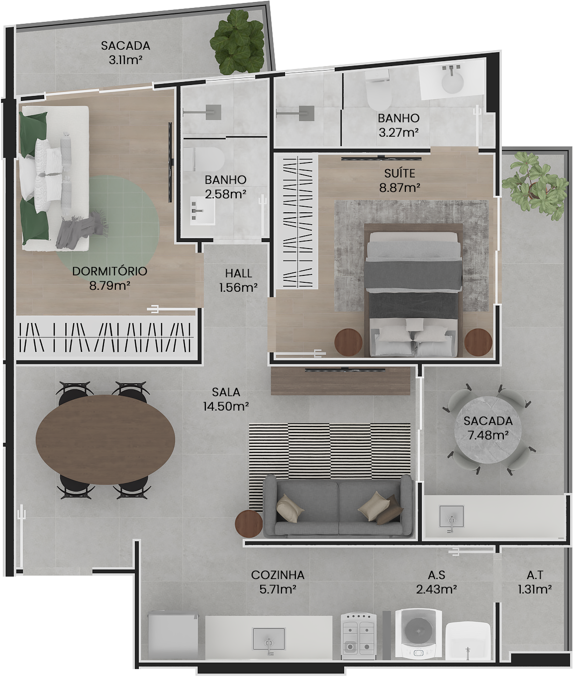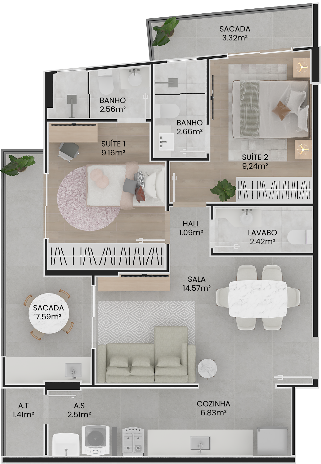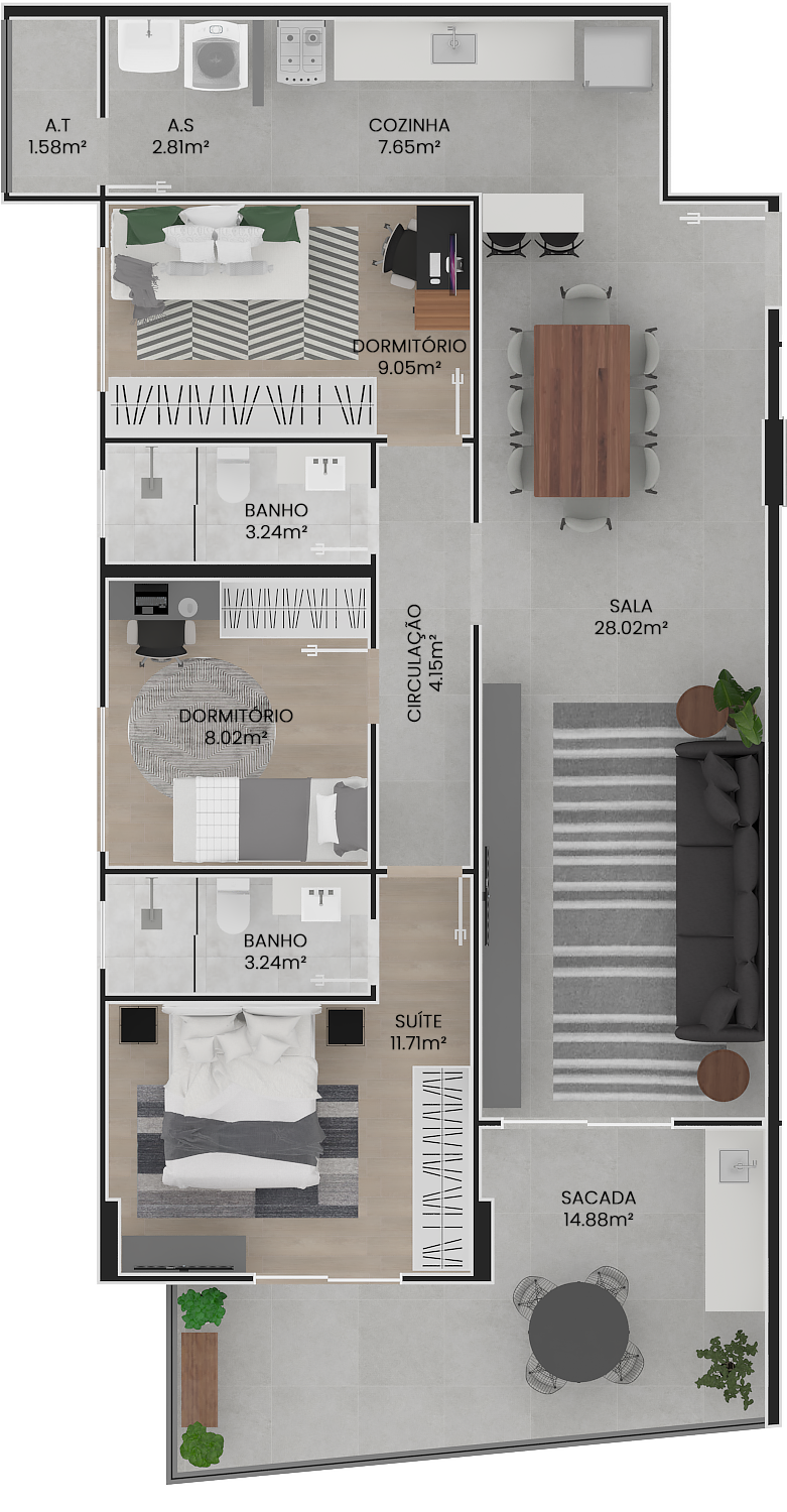 O apartamento:Plantas modernas de 2 e 3 dormitórios, com metragens entre 67 m² e 105 m², todas com suíte. Ambientes bem distribuídos entre salas de estar e jantar, cozinha, área de serviço e amplas varandas. Algumas unidades tipo Garden possuem áreas privativas externas, ideais para quem busca um espaço extra ao ar livre.