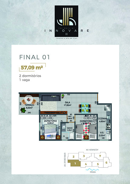 O apartamento:Apartamentos de 2 dormitórios, com plantas entre 50 m² e 57 m², distribuídos em ambientes bem planejados entre sala de estar e jantar, cozinha, área de serviço, banheiro social e varanda. Todas as unidades contam com 1 vaga de garagem em sistema coletivo.